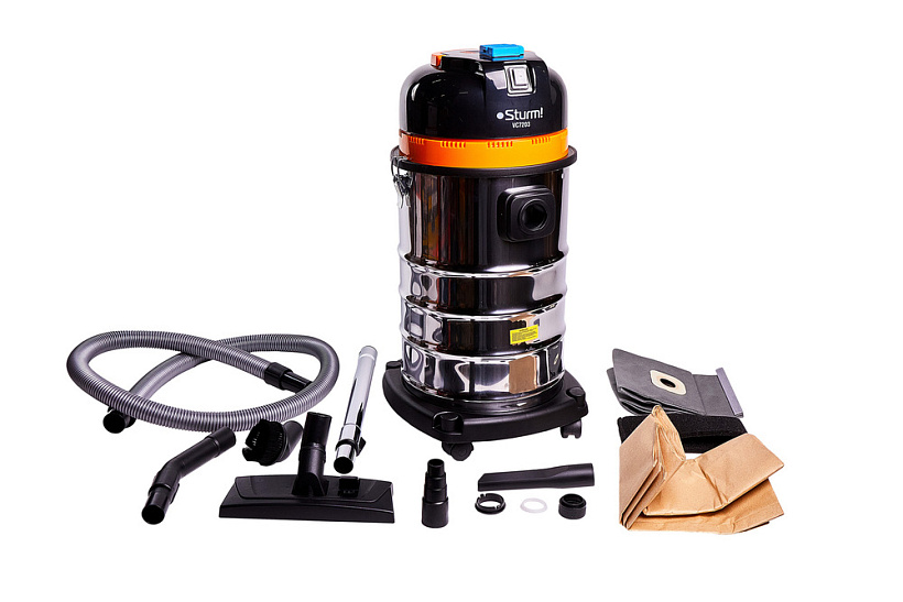 Sturm VC7203 – универсальный строительный пылесос для интенсивной эксплуатации – незаменимый помощник при уборке, как в мастерских, так и в бытовых помещениях, офисах или квартирах. Представляет оптимальное сочетание производительности, выверенной эргономики и широкого функционала. Благодаря наличию вместительного 30 литрового бака из нержавеющей стали пылесос позволяет производить уборку на достаточно больших площадях, без необходимости его частой очистки. Модель оснащена мощным 1600 Вт электромотором, позволяющим добиться высоких показателей по скорости воздушного потока (до 40 м / с) и разрежения на входе (до 17 кПа) – это способствует быстрому и эффективному удалению мусора и пыли. Дополнительную надежность при работе гарантирует встроенная защита двигателя от перегрева. Помимо традиционного режима всасывания, конструкция пылесоса предусматривает и возможность выдува воздуха, идеально подходящую для экспресс-очистки от мусора рабочих столов и верстаков, а также очистки штроб и т д. Кроме того, устройство может эффективно применяться и для сбора негорючих жидкостей. Важной особенностью модели Sturm VC7203 является функция синхронного старта, позволяющая использовать пылесос, как единую систему с другим инструментом – при ее активации запуск пылесоса производится автоматически сразу после запуска основного инструмента, что положительно влияет на удобство работы и позволяет сконцентрировать внимание пользователя преимущественно на рабочем процессе, а не вспомогательных операциях. Модель комплектуется металлической телескопической трубкой со ступенчатой регулировкой длины, двухметровым высокопрочным гофрированным шлангом, а также широким набором насадок, обеспечивающих универсальность применения. Удобству перемещения пылесоса с места на место способствует платформа на 4-х независимых колесах.