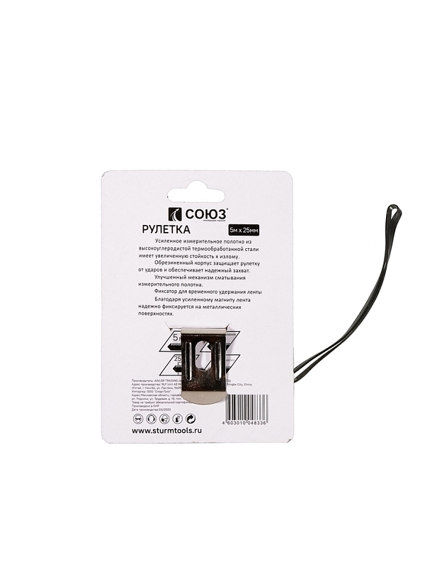 Рулетка 5x25мм, обрезиненная, магнит на зацепе, СОЮЗ
