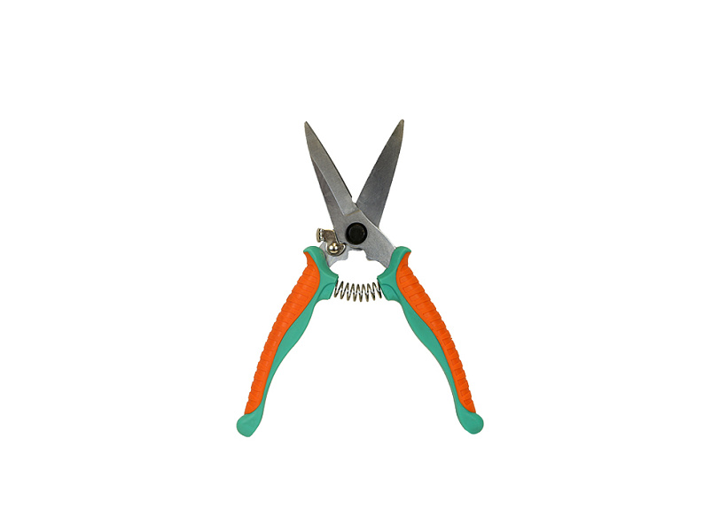 Ножницы обладают двухкомпонентными рукоятками из высококачественного пластика, фиксатором лезвий для безопасного и удобного хранения.