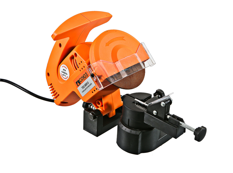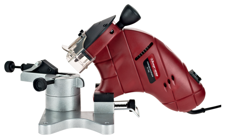 Литое металлическое основание обеспечивает точную фиксацию цепи и правильный угол наклона точильного модуля для получения качественного результата заточки. Ограничитель угла наклона обеспечивает получение одинаковой режущей кромки зубьев на всех звеньях затачиваемой цепи.