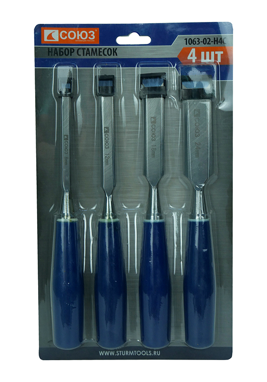 1063-02-H4C Набор стамесок, 6, 12, 18, 24 мм, УГЛЕРОДИСТАЯ СТАЛЬ, 50 HRC, СОЮЗ