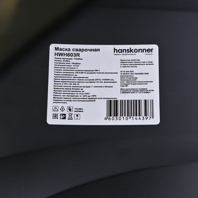 Маска сварщика Hanskonner HWH603R с привлекательным дизайном и технологией цветопередачи TrueImage. Маска, оснащённая автоматическим светофильтром высокого качества с классом защиты 1/1/1/2, гарантирует максимальную защиту глаз и лица от ультрафиолетового излучения, инфракрасного света и ярких вспышек дуги при сварке в режимах MMA, MIG-MAG, TIG, Plasma.