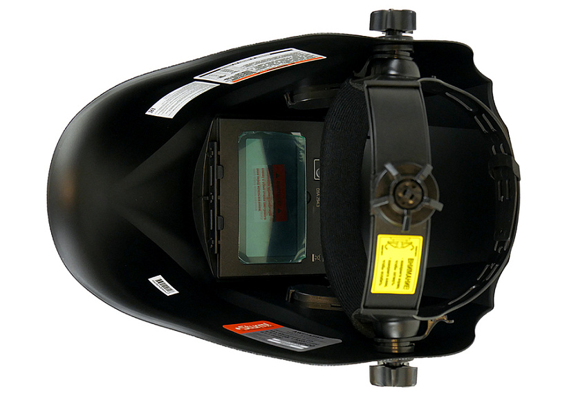 Щиток оснащен удобной крепежной 3D системой с простой настройкой под любой размер головы. Для точной подгонки наголовной ленты применен поворотный механизм с автофиксацией, а комфортное положение маски по высоте можно предварительно выставить с помощью реечного пошагового механизма. Ручка фиксации щитка для удобства имеет крупную насечку, позволяя пользователю выполнить быстрый зажим, не снимая сварочных рукавиц.