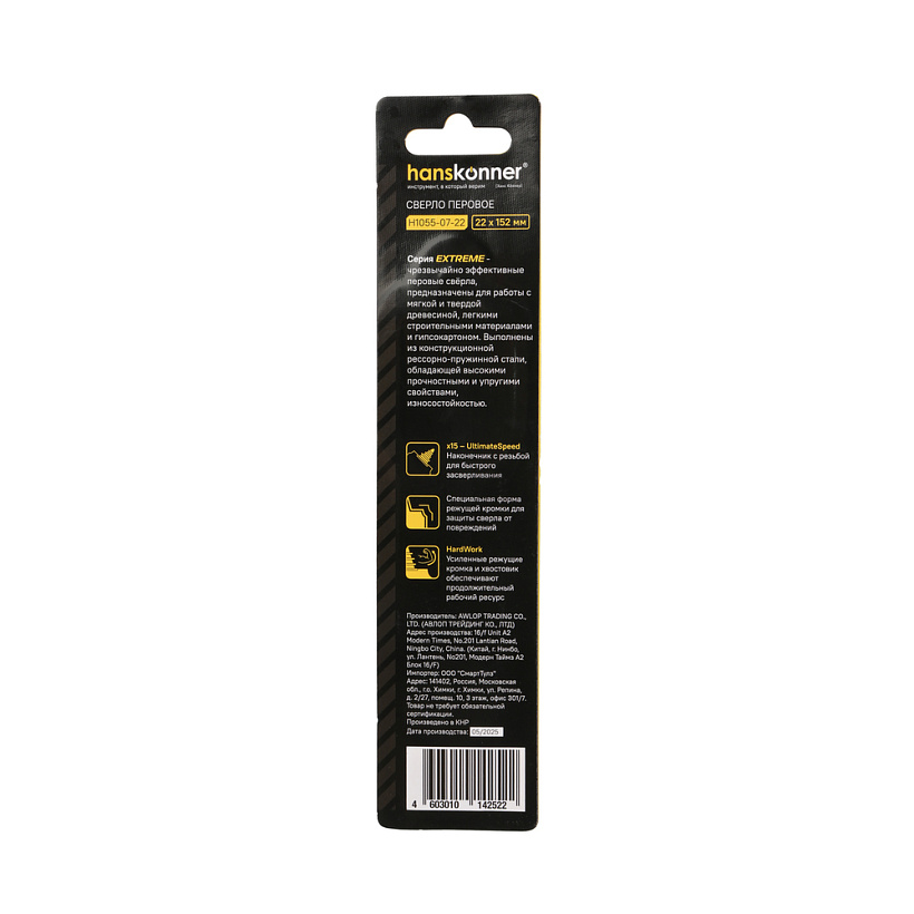 Сверло перовое по дереву 22мм, высококачеств. сталь, шестигр. хвостовик, Hanskonner