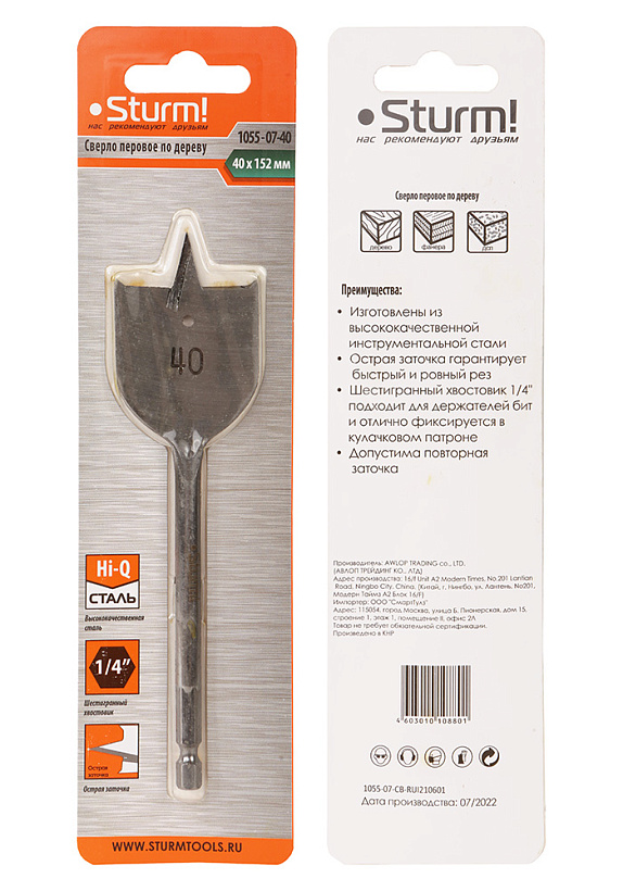 Сверло перовое по дереву, 40мм, шестигранный хвостовик, Sturm!