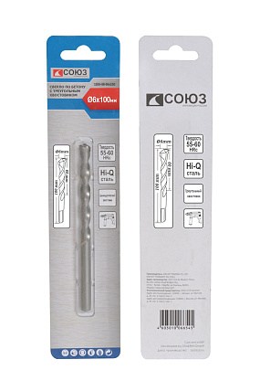Сверло по бетону, 6x100, твердосплавная напайка BK8, треугольный хвостовик, Союз