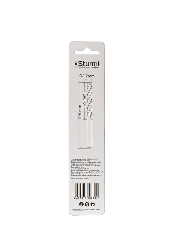 Сверло по металлу Sturm! 3,2х106 мм, сталь HSS, удлинен., 118° ,блистер 2 шт