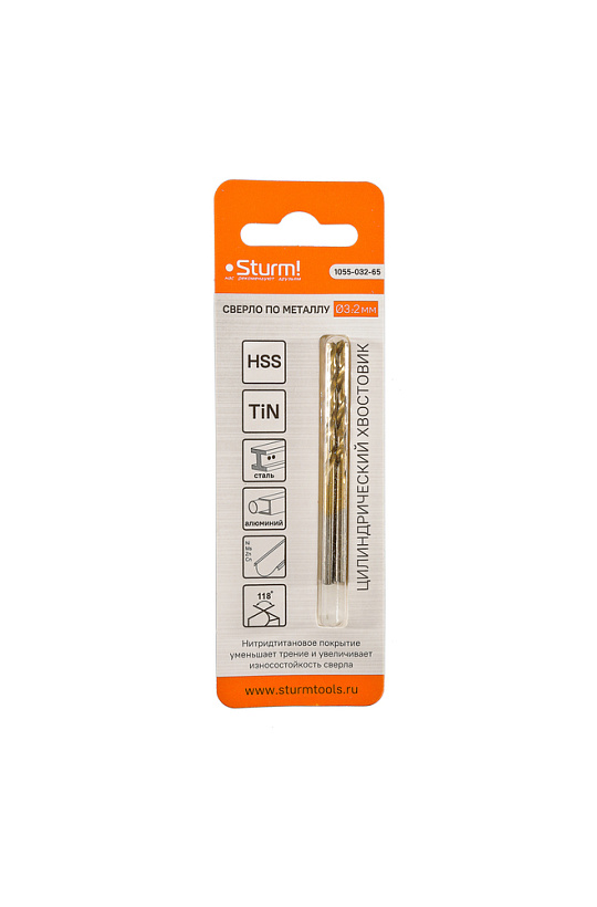Сверло по металлу Sturm! 3,2х65 мм, сталь HSS, нитридтитан., 118° ,блистер 2 шт