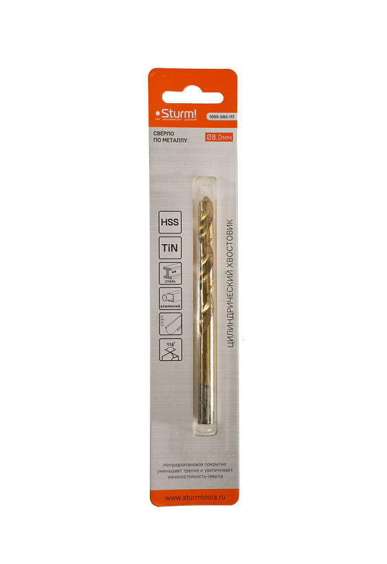 Сверло по металлу Sturm! 8,0х117 мм, сталь HSS, нитридтитан., 118° ,блистер 1 шт