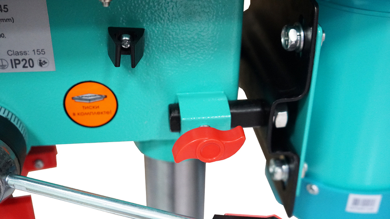Сверло опускается с помощью штурвала с тремя рукоятками, контроль глубины производится с помощью индикаторной линейки, расположенной на переднем торце корпуса.
