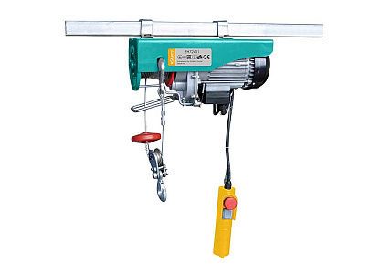 - Тельфер оснащен электромотором мощностью 1050 Вт и барабаном с намотанным на него высокопрочным стальным тросом – устройство обеспечивает подъем груза массой до 250 кг на высоту до 12 метров со скоростью 8 м / мин.