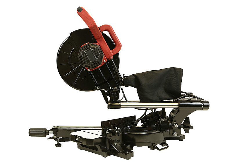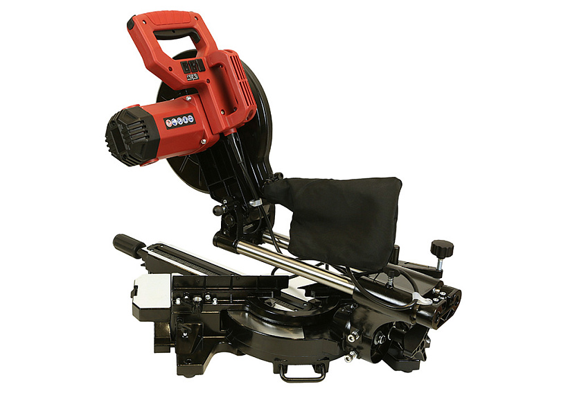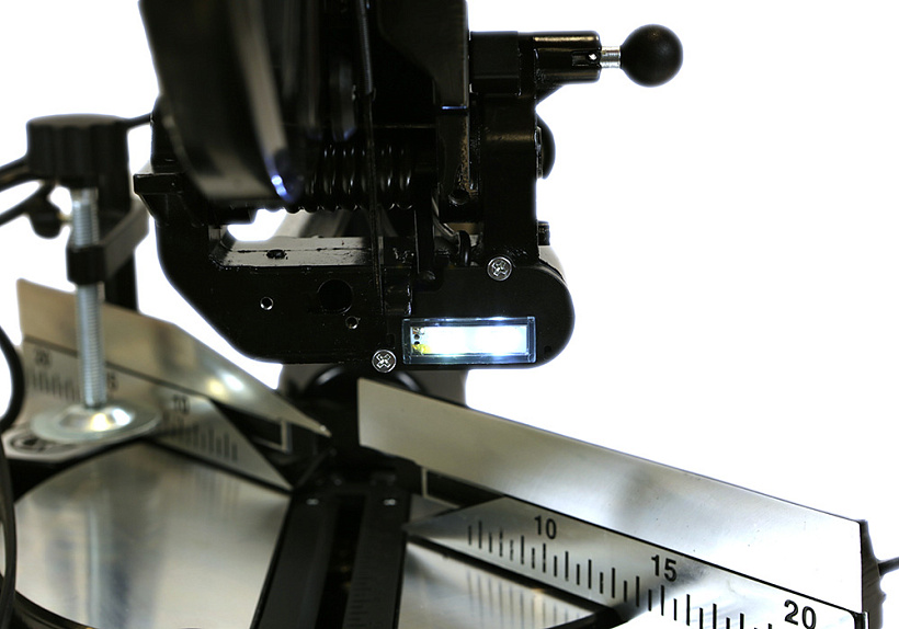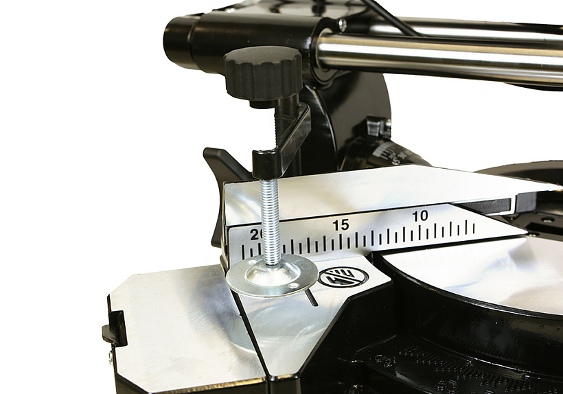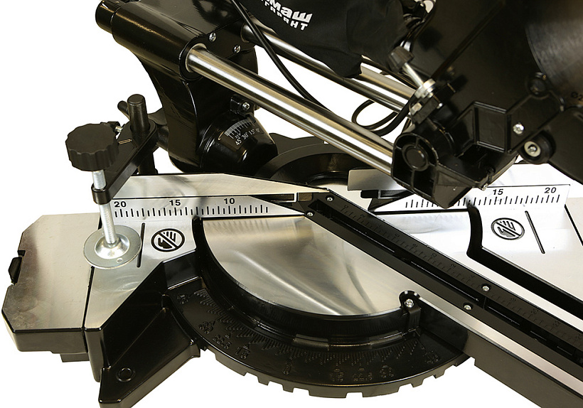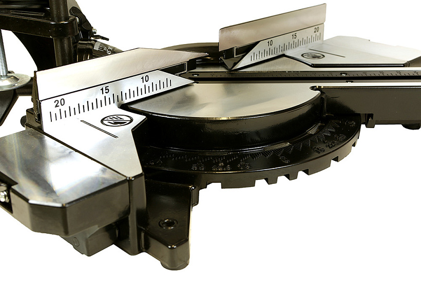 Инструмент оснащен увеличенным пильным диском, встроенным протяжным механизмом, винтовым зажимом для прочной фиксации заготовок и предотвращающие их опрокидывание выдвижными боковыми суппортами. Благодаря большому поворотному столу, фиксирующемуся в любом положении, наличию удобной регулировки с прецизионными шкалами для точной настройки нужного наклона пилу можно уверенно выставить в рабочую позицию на предварительно заданные параметры косых пропилов.