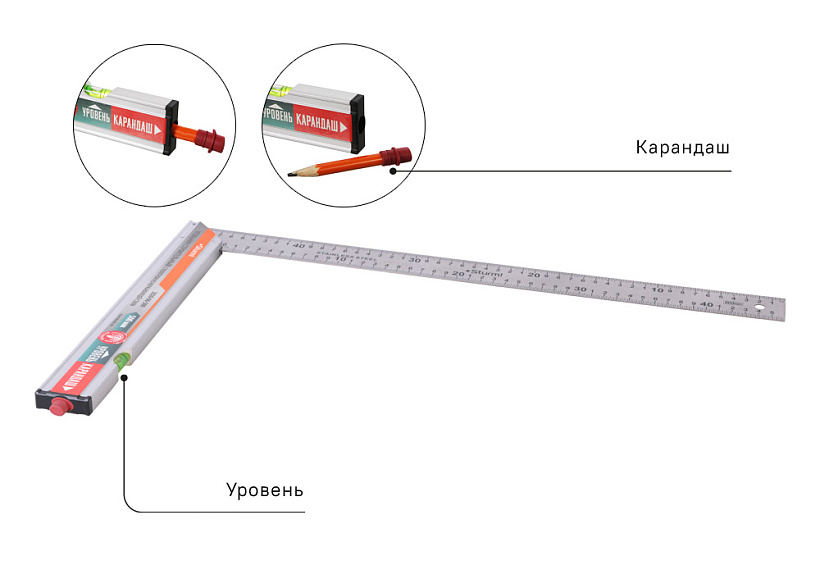 Уникальная запатентованная система позволяет хранить карандаш прямо в корпусе угольника, благодаря чему он будет всегда под рукой.Переход от замера к разметке и обратно стал максимально быстрым, что в разы экономит время в процессе работы. Крепление осуществляется специально разработанной резиновой втулкой, которая надёжно удерживает карандаш, а так же позволяет его быстро извлечь и вернуть на место, исключая возможную потерю. Колба пузырькового уровня из ударопрочного плексигласа, полотно из нержавеющей стали с антикоррозийным покрытием, гравированная шкала устойчива в внешнему воздействию и сохранению точных показаний