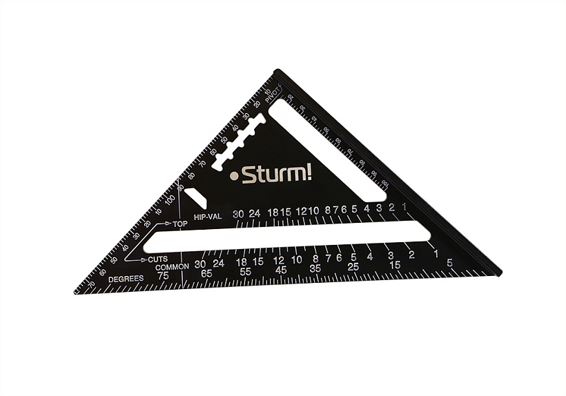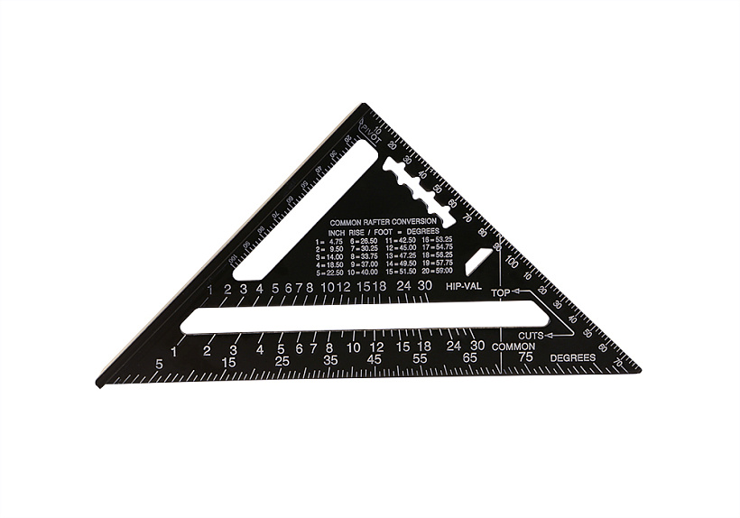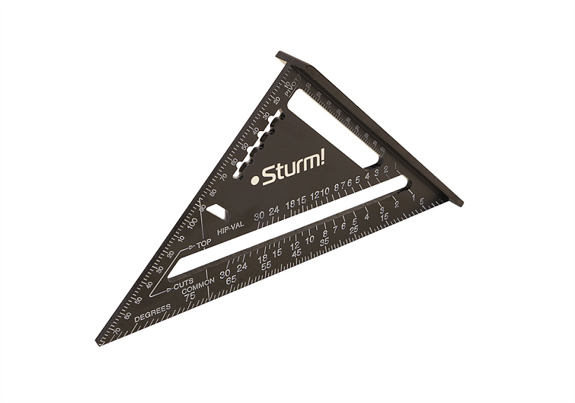 Изделие представляет собой комбинированный угольник для быстрой разметки углов 90° и 45°. Содержит в себе функции транспортира для точной разметки деталей во время производства стропильной системы каркасного дома, системы лестниц и лестничных маршей.