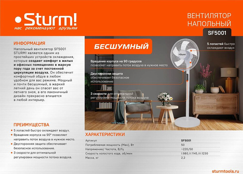 Вентилятор Sturm! обеспечит комфортный обдув в любом удобном для вас режиме. Мощный и почти бесшумный, в жаркий летний день он спасет вас от летнего зноя. Компактный напольный вентилятор помещается в любой комнате и легко переносится при необходимости.