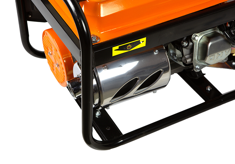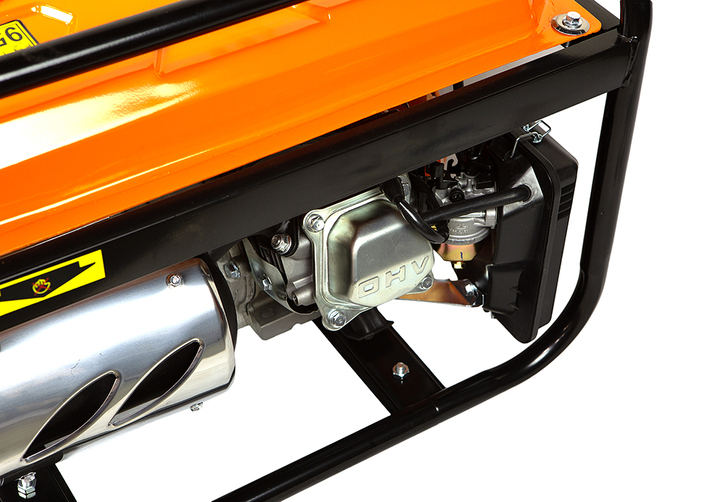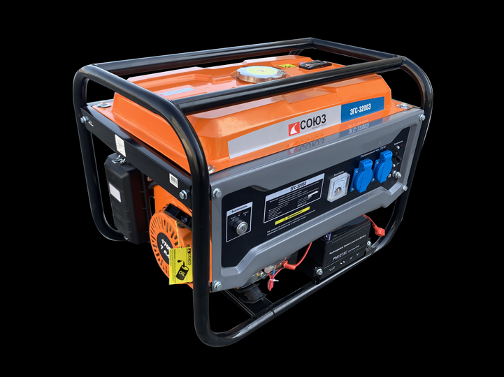 СОЮЗ ЭГС-3200Э – универсальный однофазный бензиновый генератор. Максимальная мощность –3.0 кВт. Номинальная мощность – 2.5 кВт. Отлично подойдет для резервного электроснабжения загородного дома или организации удаленной рабочей площадки. Имеет классическую компоновку: двигатель и альтернатор смонтированы внутри прочной усиленной трубчатой рамы, страхующей узлы генератора и бензобак от случайных повреждений, при транспортировке. Главная отличительная особенность СОЮЗ ЭГС-3200Э – наличие системы электрического запуска с помощью встроенного электростартера. Также, в качестве альтернативы, в случае необходимости, всегда можно задействовать и традиционный вариант запуска – с помощью ручного стартера Модель оснащается четырехтактным бензиновым двигателем 170F рабочим объемом 212 см3 с верхним расположением клапанов (OHV) и воздушным охлаждением. Тип альтернатора – синхронный, с щеточно-коллекторным узлом. Синхронный альтернатор способен легко переносить индуктивные нагрузки и позволяет запитывать даже достаточно мощный строительный электроинструмент. За автоматическую стабилизацию выходного напряжения отвечает встроенная система AVR (Automatic Voltage Regulation). Панель управления оснащена контрольным аналоговым вольтметром, а также двумя пылезащищенными розетками переменного тока 220В на 16А с автоматическими подпружиненными крышками. Предусмотрена система поддержания энергобезопасности, принудительно отключающая агрегат при превышении допустимой нагрузки или коротком замыкании, а также система аварийной остановки двигателя при критически низком уровне масла.