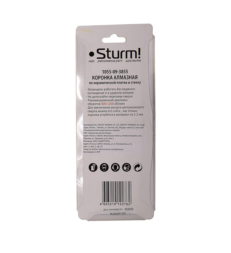 Коронка алмазн. По керам. Плитке и стеклу 38x55 мм, с центрир. Сверл. Sturm!