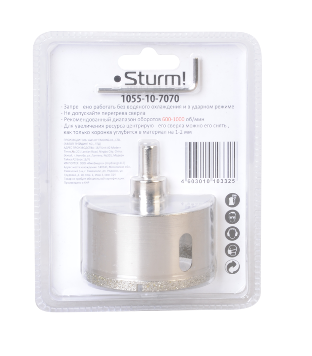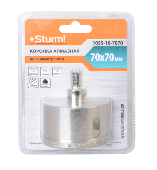 Коронка алмазная по керамограниту 70 х 70 мм,3гр. Хв., с центрир. Cверл. Sturm!