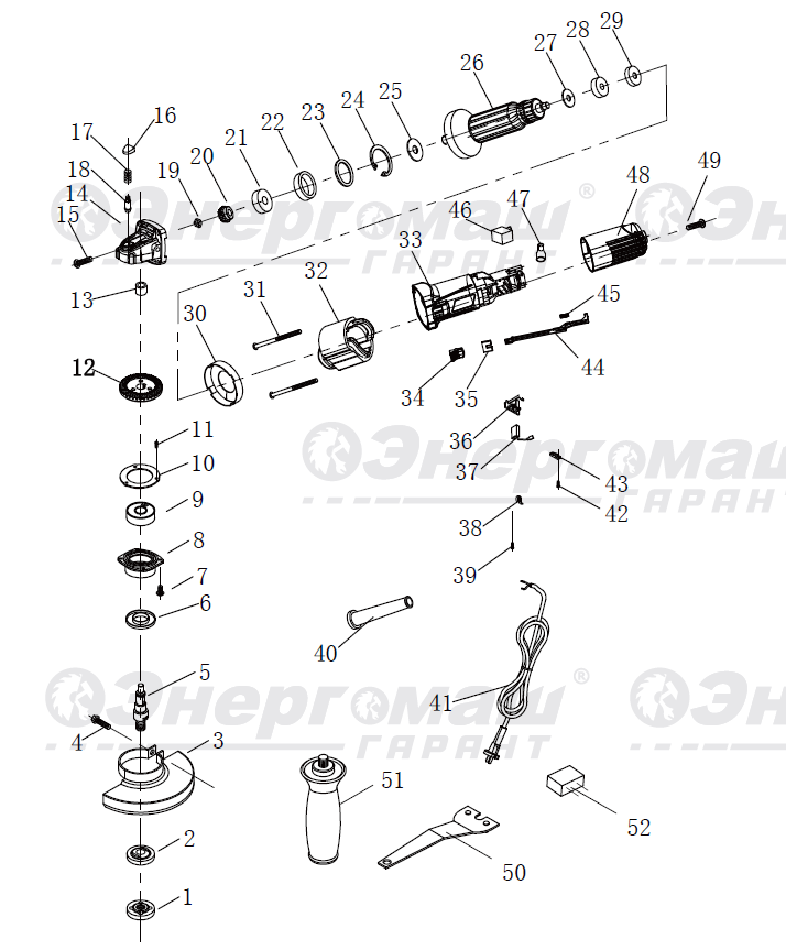 Гайки для крепления диска, комплект щеток, дополнительная рукоятка, ключ, защитный кожух в комплекте.