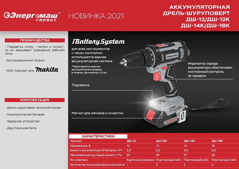 Аккумуляторный шуруповерт Энергомаш ДШ-18К 1BatterySystem