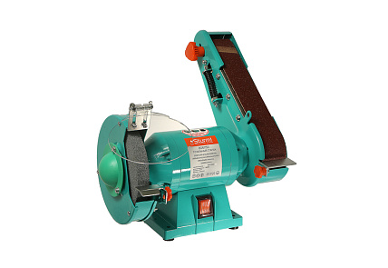 - Точило имеет черновой шлифовальный круг и чистовую шлифовальную ленту, с защитными кожухами и искрозащитным экраном, регулируемыми рабочими упорами, что делает работу со станком удобной и безопасной.