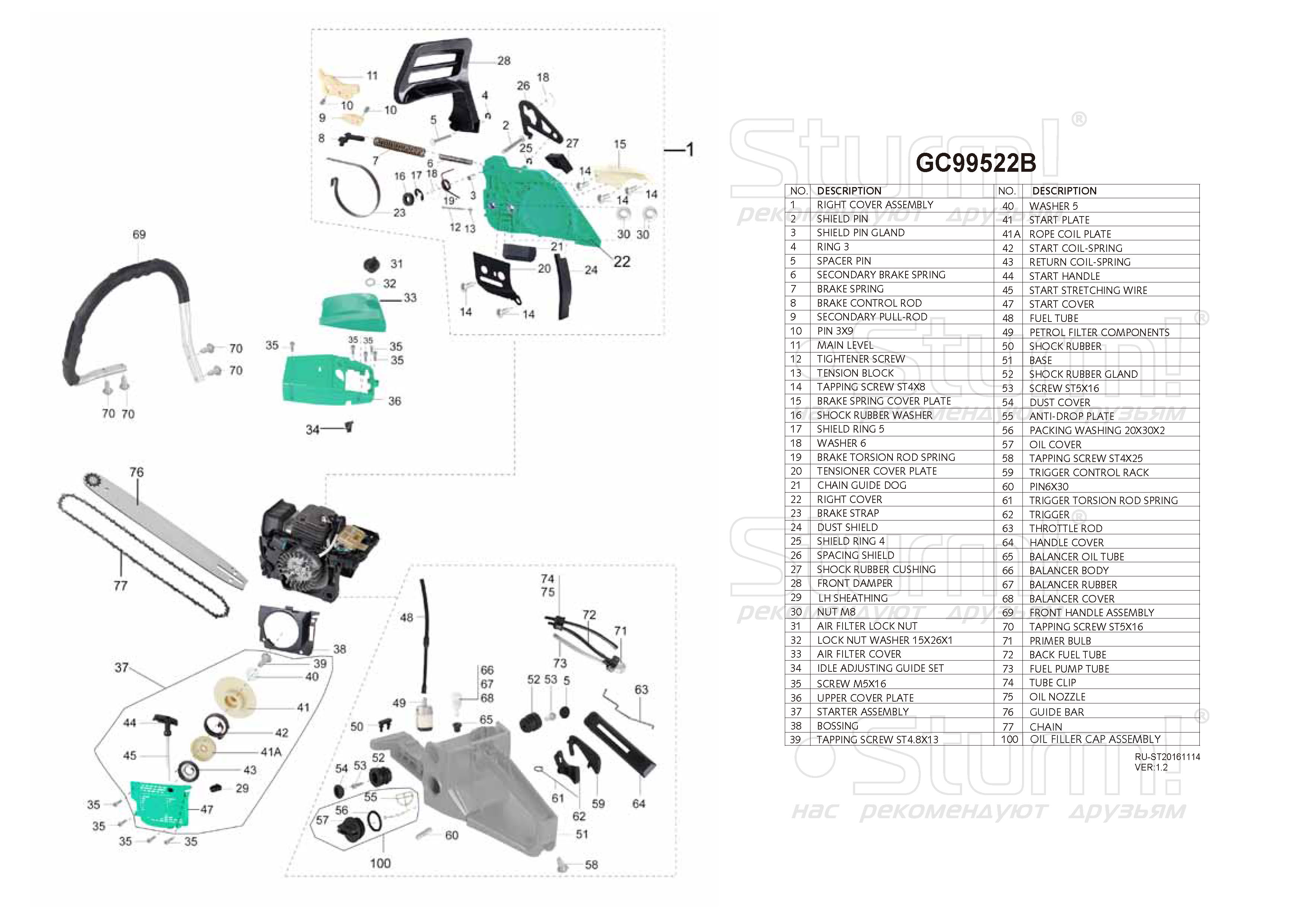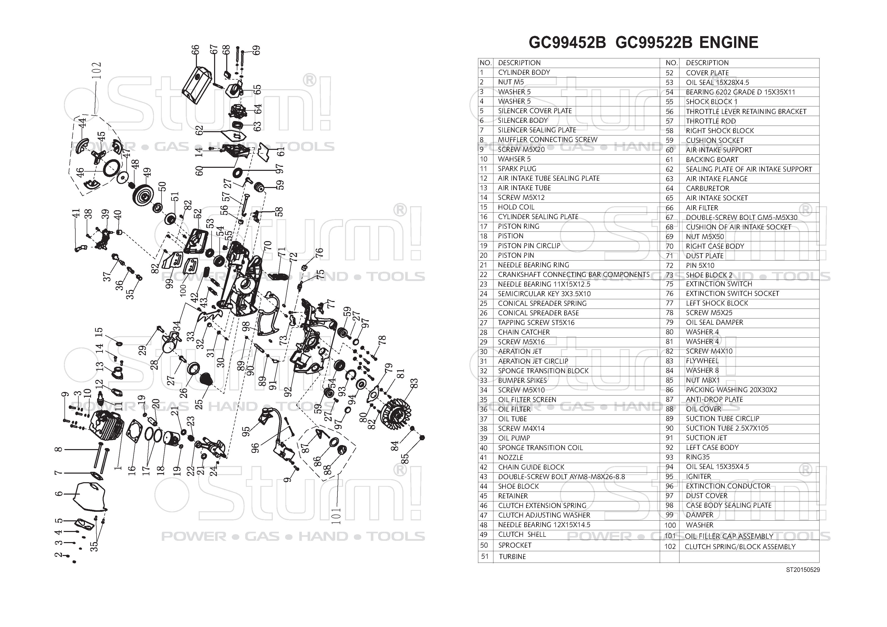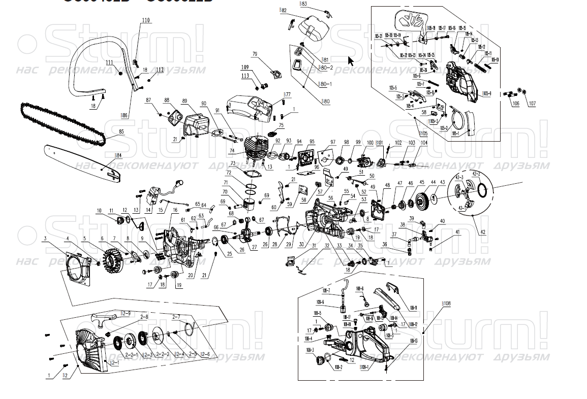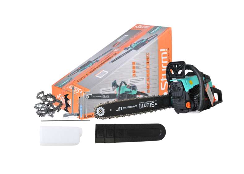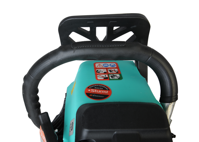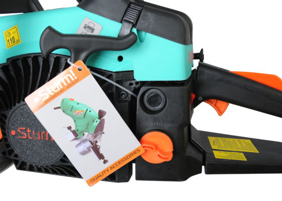 Sturm GC99522B – надежная универсальная бензиновая пила – предназначена для широкого спектра работ: от расчистки лесных насаждений до эксплуатации на приусадебных территориях. Оснащена производительным двухтактным двигателем рабочим объемом 52 куб см (мощность 2.9 кВт / 3.95 л. с.) и пильной гарнитурой увеличенной размерности – 455 мм, что позволяет эффективно использовать инструмент для распиловки древесины различной толщины. В конструкции пилы применен ряд хорошо отработанных и показавших свою эффективность технических решений: хромоникелевое покрытие цилиндра снижает вероятность повреждения его стенок при недостаточной смазке или перегреве, электронная система зажигания гарантирует стабильность работы при различных температурных условиях, бумажный фильтр «автомобильного» типа имеет повышенную степень очистки воздуха, что предотвращает попадание в карбюратор пыли, металлические крышки тормоза и стартера способствуют повышению прочности пилы и уменьшению вибрации. Инструмент обладает отличной эргономикой: на рукояти нанесена специальная насечка для удобства хвата, а их форма обеспечивает лучший контроль пилы при осуществлении горизонтальных пропилов и пропилов под углом. Модель проста в эксплуатации и не вызовет затруднений у начинающих пользователей. Легкость запуска гарантируют система облегченного старта с дополнительной пружиной и праймер, позволяющий уверенный пуск инструмента в условиях низких температур и после длительных перерывов в эксплуатации. Важной особенностью является боковое расположение механизма натяжения цепи, за счет чего существенно упрощается ее регулировка и исключается риск повреждения рук пользователя от случайного контакта с зубьями цепи. Возможность безынструментального доступа к карбюратору, фильтрующему элементу и свече зажигания обеспечивает удобство обслуживания пилы даже в самых неприспособленных условиях.