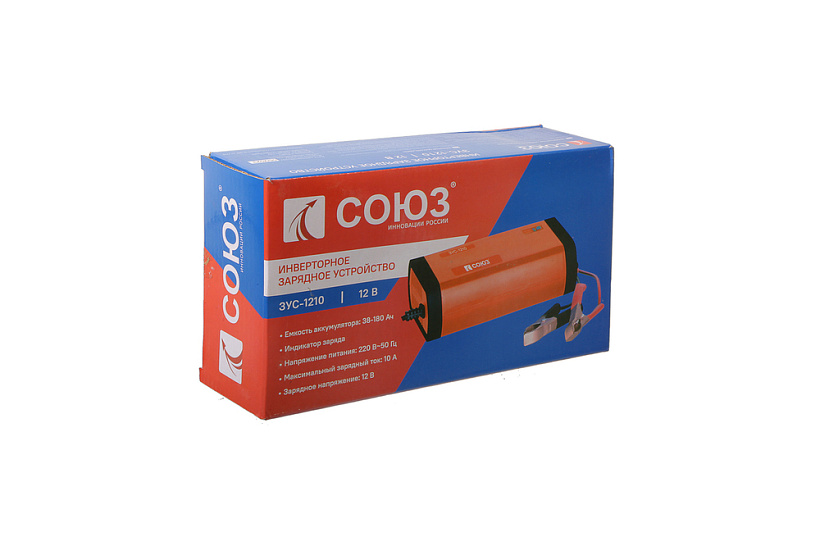 СОЮЗ ЗУС-1210 — портативное инверторное зарядное устройство. Предназначено для автоматической зарядки как классических свинцово-кислотных, так и AGM (технология Absorbent Glass Mat), а также гелевых (GEL) аккумуляторных батарей напряжением 12 В и емкостью от 30 до 100 Ач. Модель выполнена в компактном корпусе — благодаря своим минимальным габаритам очень удобна в хранении и транспортировке. Устройство предельно простое в эксплуатации и не требует специальных навыков — пользователю достаточно лишь подключить провода с зажимными клеммами к аккумулятору, соблюдая полярность, и включить прибор в сеть. Контролировать процесс зарядки помогает световая индикация: красный цвет индикатора — аккумулятор заряжается, зеленый цвет индикатора — аккумулятор уже заряжен. Ток зарядки СОЮЗ ЗУС-1210 составляет 10 А. Для обеспечения безопасности пользователя в случае любых внештатных ситуаций модель оснащена необходимым комплексом защиты: от перегрева, от короткого замыкания, от неверной полярности подключения.